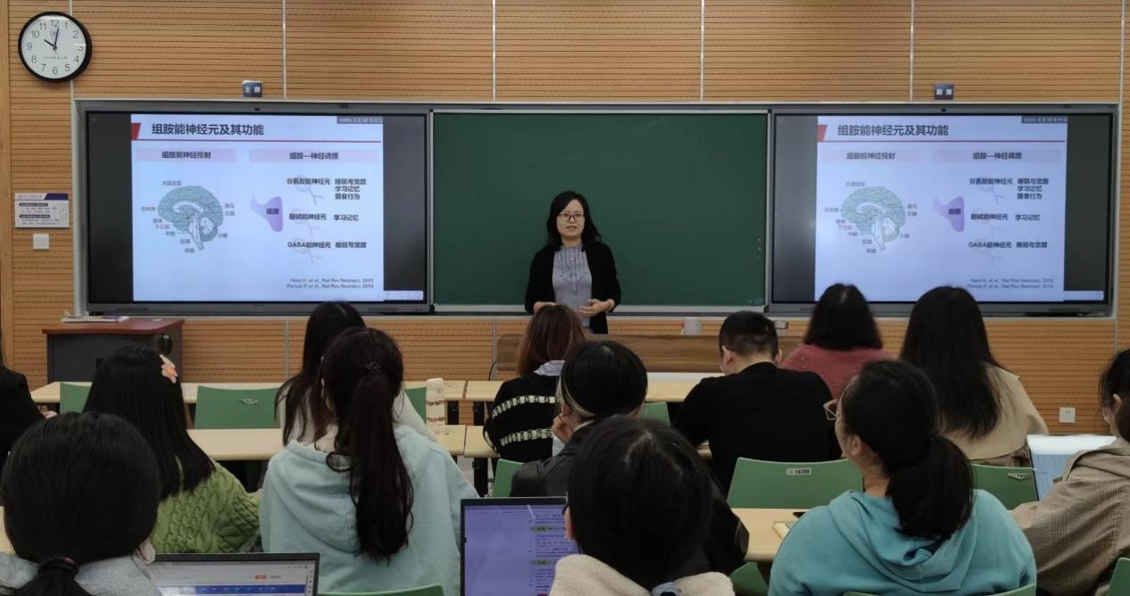从寻找药物靶点的角度引入,胡教授向同学们展示了从构建动物模型,到基因敲降、过表达以及下游信号、神经环路研究,最终发掘新靶点、开发新药的整个完整流程,同时也展示了探求脑疾病药物靶标的常用实验方法与前沿技术,为同学们后续开展相关研究提供启发和思路。