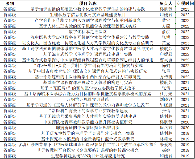 近五年,公司共主持省级公司产品改革项目27项,其中全国中医药高等教育“十四五”规划教育科研课题3项,教育部高等公司中西医结合类专业教学指导委员会教育研究课题1项,浙江省高校公司产品改革项目8项、浙江省课程思政教学研究项目2项、产学合作协同育人项目14项。