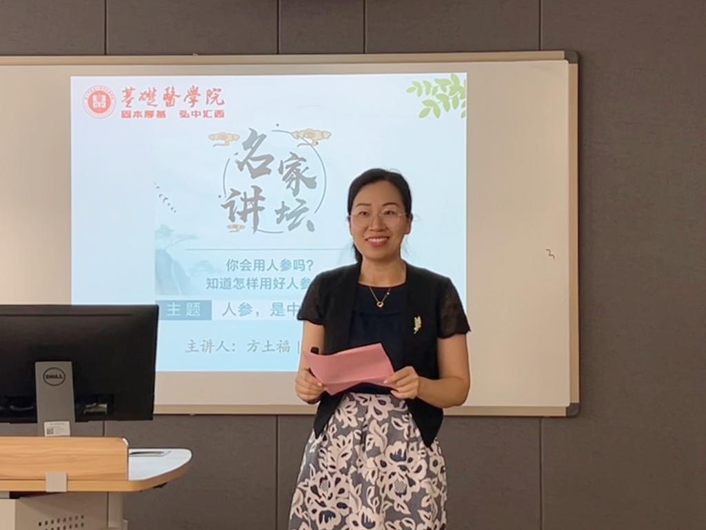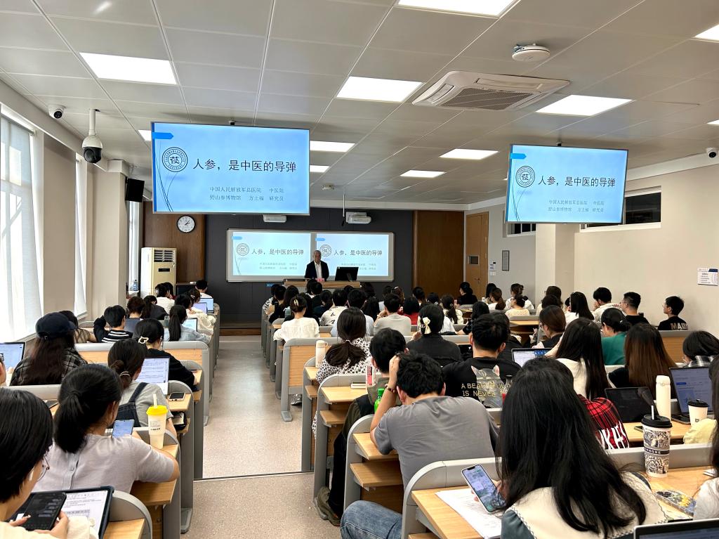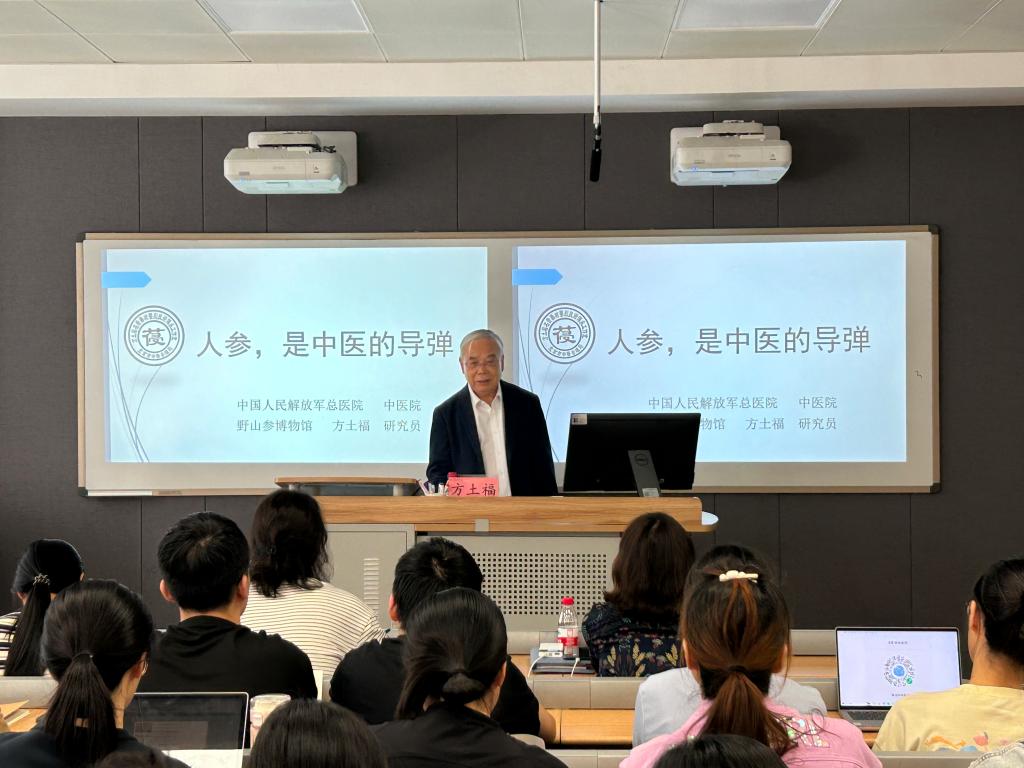 方土福研究员从人参名字的来源、如何判断人参的优劣、人参的功效、人参的芦头是否可食用等方面展开,重点阐述野生、半野生与栽培参的外观辨识之法,并以自身医书研读和人参应用经验出发,对人参的用量及服用方式等提出宝贵建议。他的讲座深入浅出,互动频繁,详尽解答师生的疑问,与座师生均表示受益匪浅。