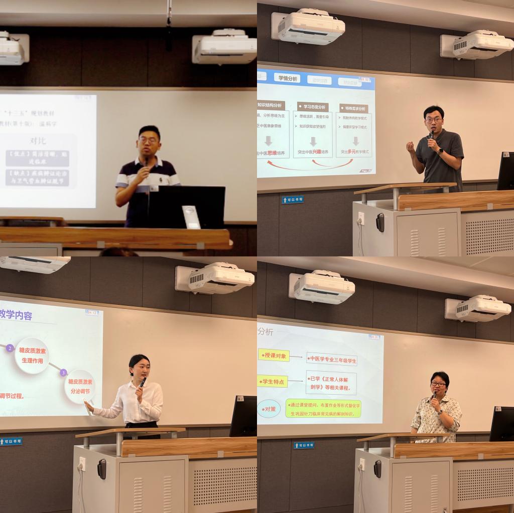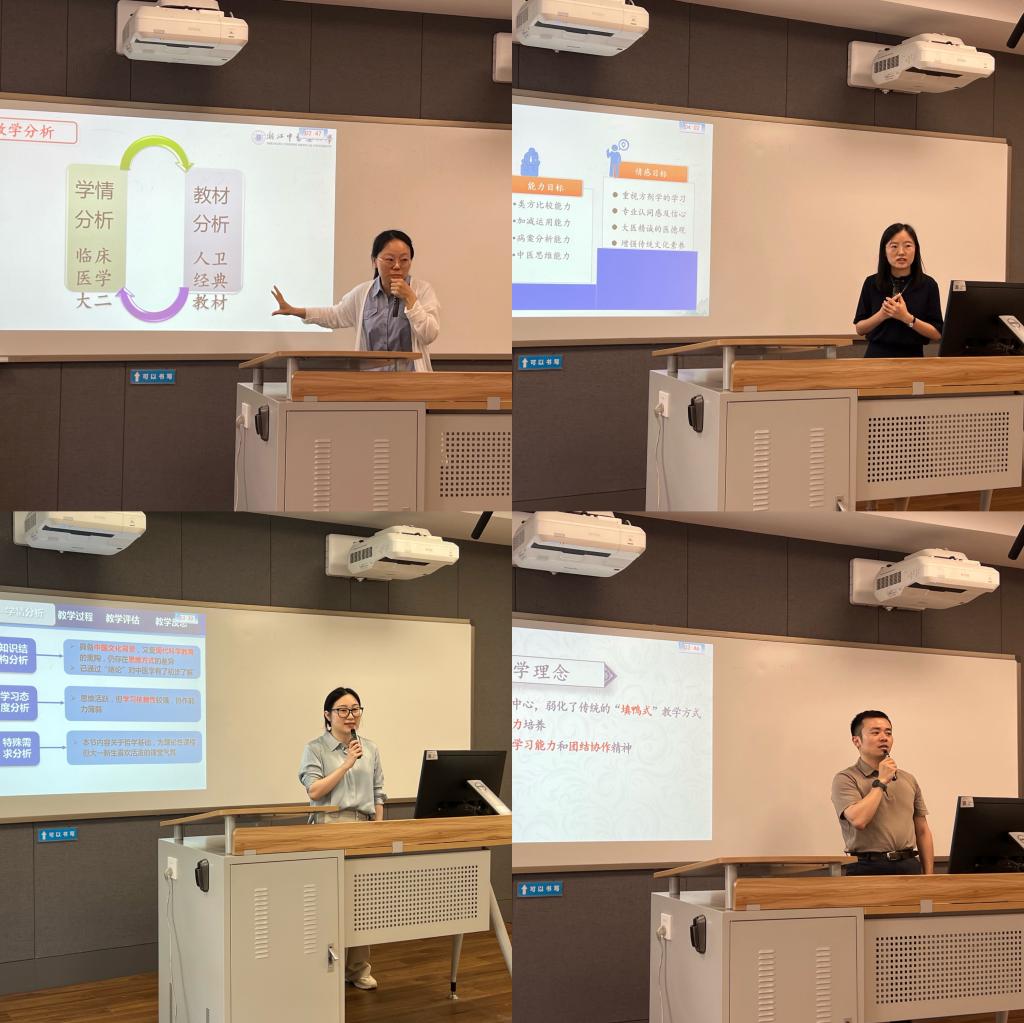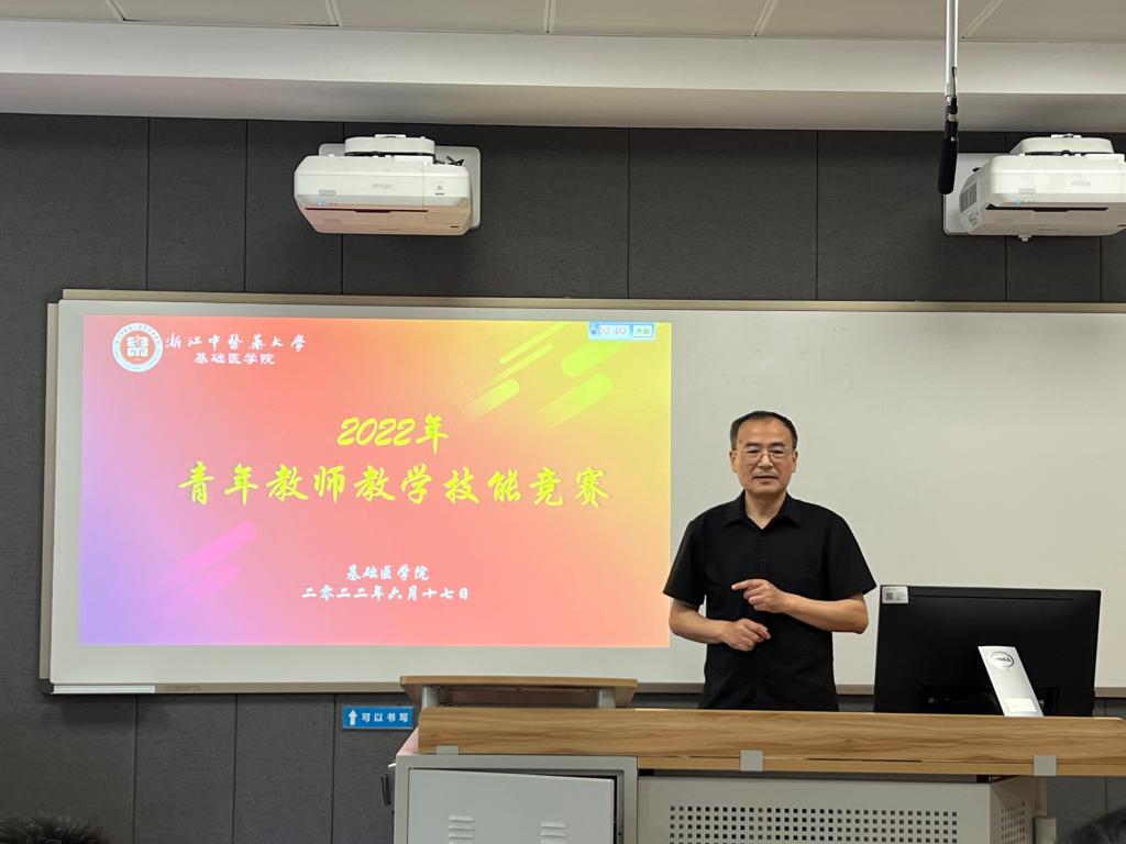 本次比赛包括教学设计和现场说课两部分。经过前期教研室选拔推荐,共有来自10个教研室的17位教师参加院赛。今天的比赛主要是现场说课环节,参赛选手依次按照抽签顺序上台比赛,通过赛前精心准备,参赛教师准确把握教学重难点,合理使用教学手段、精心设计教学环节,在紧凑的五分钟里,从教材内容、学情分析、教学目标、教学重难点、教学方法、教学过程、教学反思以及课程思政元素等方面进行了阐释,充分展现了深厚的教学功底、鲜明的教学特色和独特的个人魅力,获得了现场阵阵掌声。