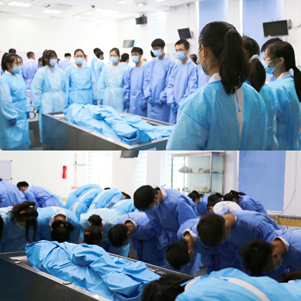 观看视频后,同学们对各自的大体老师进行了简短的默哀仪式,同学们围城一圈,对大体老师默哀一分钟,并进行三鞠躬。然后才开始与大体老师的无声对话、亲密接触。