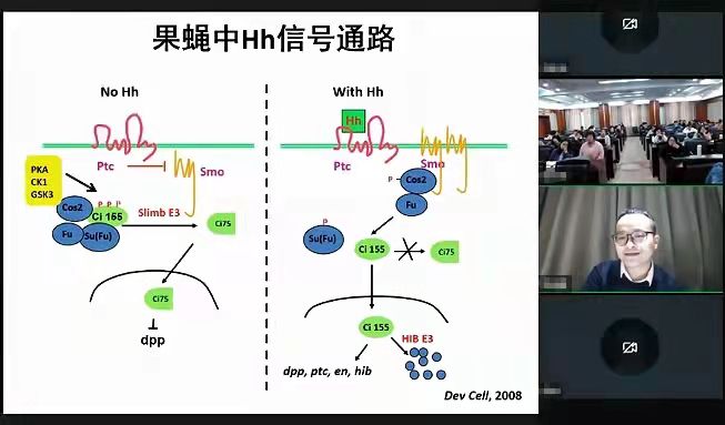 山东农业大学周紫章教授进行了《Ci/Gli蛋白降解之谜》的讲座。周紫章教授以果蝇为模型,详细介绍了Ci蛋白的研究背景,其双重降解的机制以及Hh通路中仍待解决的科学问题。