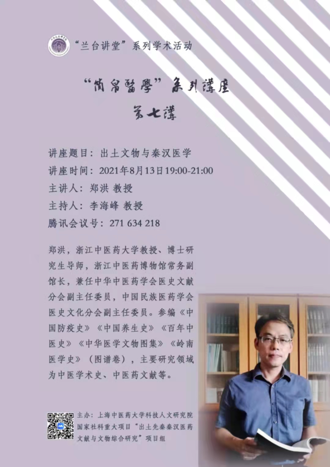 2021813日,中医医史文献学科带头人郑洪教授进行了出土文物与秦汉医学的讲座,该讲座为简帛医学系列讲座第七讲,是由上海中医药大学策划承办的全国性的系列讲座。郑洪教授,VSport体育教授,博士生导师,浙江中医药博物馆常务副馆长,兼任中华中医药学会医史文献分会副主任委员,中国民族医药学会医史文化分会副主任委员,参编《中国防疫史》、《中国养生史》等。